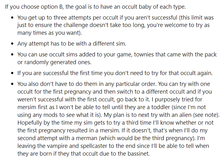 Note if you wish, you can have your sim become an occult of your choosing before this final pregnancy. - Here are the occult offspring possibilities at the time of writing this challenge if you have the required packs: