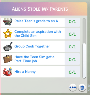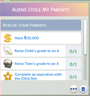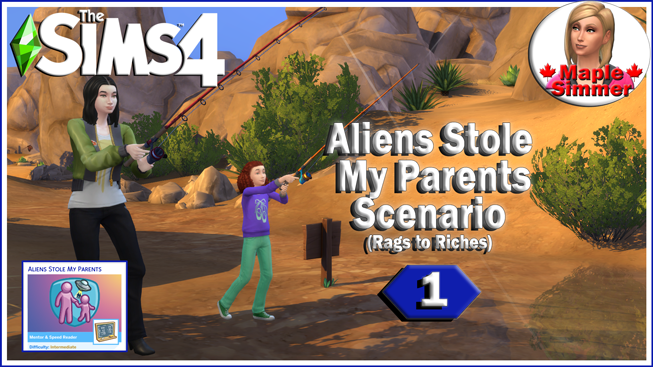 This scenario requires you to start with a family with one teen, one child and at least one sim who is young adult and over. They are able to start with a home, however my twist is that they will be starting on an empty lot and only the 500 simoleons the aliens left them.