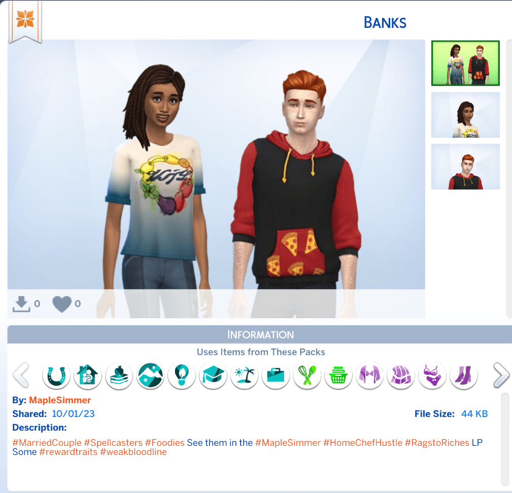 Anna and Rudy Banks are the young married spellcaster couple embarking on this challenge. Anna is a family oriented, creative foodie with the bonus trait of essence of flavour from choosing a food aspiration (Appliance Wiz). Rudy is a genius foodie rancher with the bonus trait of business savvy from choosing a fortune aspiration (Market Magnate).
