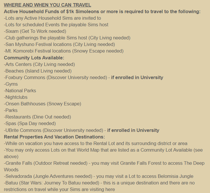 The ability to leave your home lot is limited, usually you need 1,000 simoleons and where you can travel to is set by house. Here is a screenshot of the details, again screenshot is from Vihisha’s blog post as of Sept 1, 2021 (Note the club gatherings should say ‘Get Together needed’, not ‘City Living’. 😊 ):