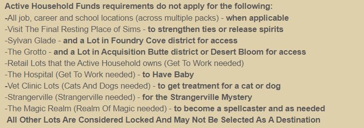 The ability to leave your home lot is limited, usually you need 1,000 simoleons and where you can travel to is set by house. Here is a screenshot of the details, again screenshot is from Vihisha’s blog post as of Oct 26, 2022 (Note the club gatherings should say ‘Get Together needed’, not ‘City Living’. ):