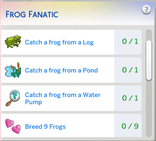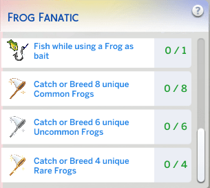 Here are the 8 of the 9 goals of the frog scenario, we will do seven of the 9 goals (we can’t fish while using frog as bait or make the frog hot pot goal not shown here, as those goals require skill in fishing or cooking respectively).